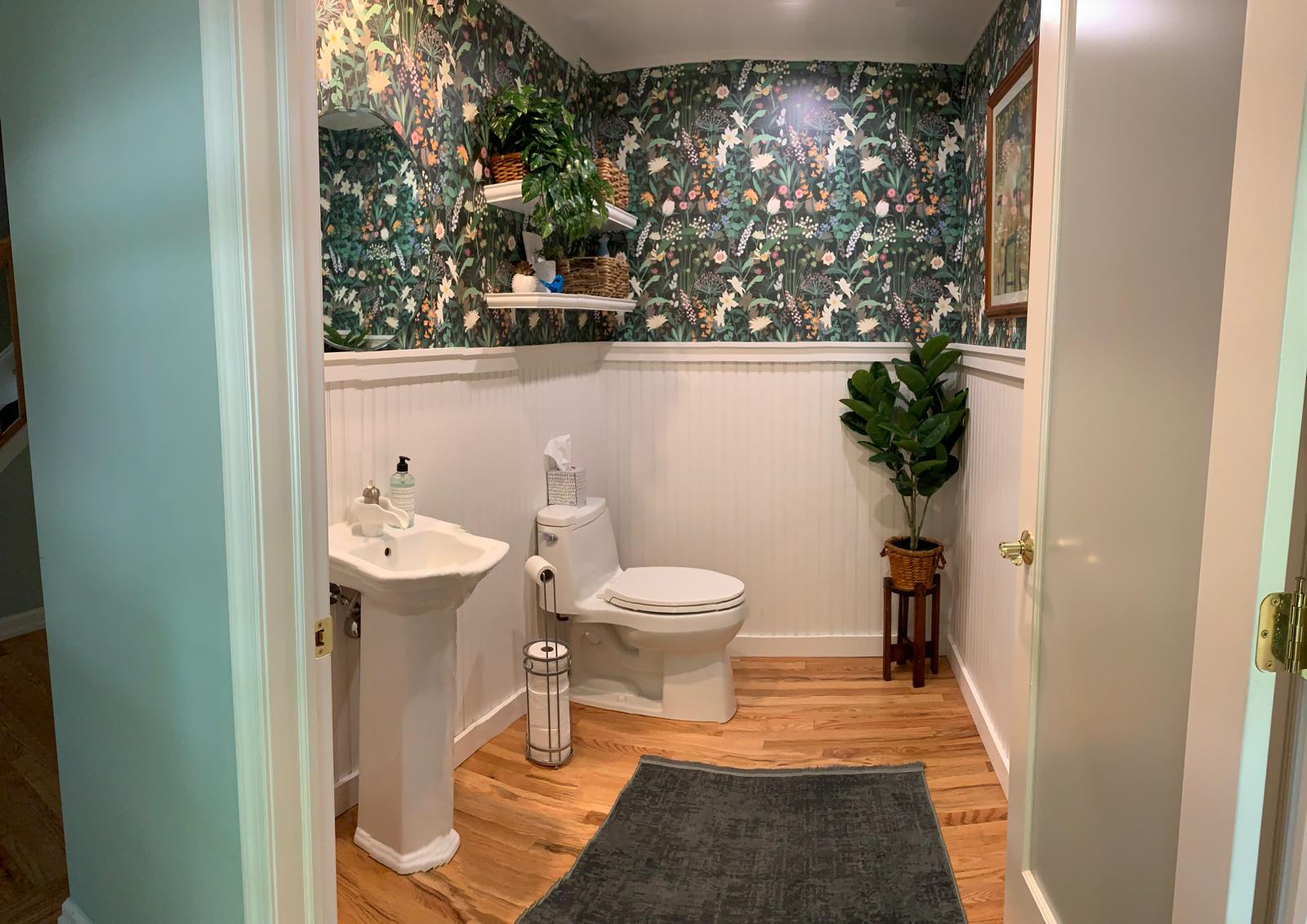 We also helped with the decor of a ground floor powder room. Its size and location allowed some leeway with the design: we worked with the homeowner to find a fun wallpaper to combine with beadboard for a fun yet timeless look.